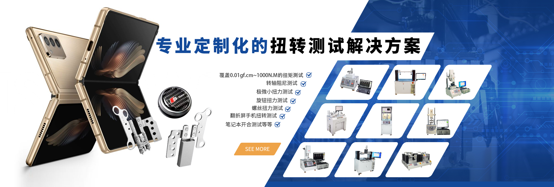 磐石測控主要產品有:荷重位移曲線機、快速按鍵力測試機(專為產線檢測研發)、三軸荷重位移曲線機、插拔力試驗機(立式/橫向/多工位)、扭力試驗機、轉軸扭力試驗機、快速扭力測試機(專為產線檢測研發)、三軸扭力試驗機、精密彈簧拉壓力試驗機、精密醫療微力試驗機、伺服壓機、非標定制、力量傳感器、軟件及控制卡等。